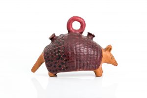 Este mes presentamos un botijo zoomorfo en forma de tatú (armadillo), realizado a mano en barro de Itá, con detalles incisos que acentúan el naturalismo de su cuerpo y cabeza. La pieza está pintada con engobes aplicados manualmente, con toques de pigmento negro que destacan los ojos y bigotes del animal. En la parte superior lleva un asa anular que, además de completar su silueta escultórica, lo convierte en un objeto utilitario pensado para el transporte de líquidos.